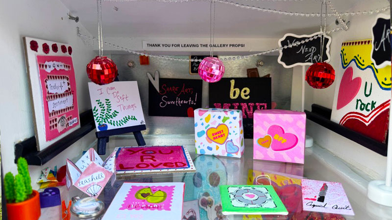 The gallery encourages visitors to participate fully: take art, leave art, share art. You might find handmade snacks, miniature paintings, or seasonal displays. Each piece contributes to a living and growing collection shaped by the community. Even the exterior rewards the careful observer with subtle geocaching symbols painted into the design.